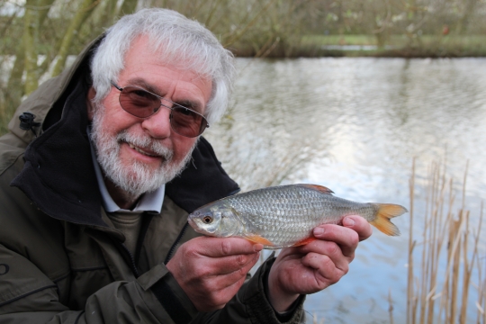 Basically I was fishing a small 2BB waggler set slightly over depth with a small tell-tale shot about 6 inches from the hook. I deliberately set up well back from the water’s edge so I could underhand swing out the bait, then let it drift in to settle a metre or so off the rod end. Free bait was kept to a minimum, just a couple of chopped prawn with each cast. It didn’t take long for my first bite, a typical Westerly roach about ½ lb. Quality roach and the odd bream came regularly over the next two hours, then the float sailed away and something much larger set off across the lake, too big to be a perch I suspected a carp had taken a liking to my prawn and so it proved. A while later I managed to net a lovely linear, not massive by modern carp standards but great fun on the light gear. Time to rest the swim for a bit and put the kettle on. Back on the rod, the afternoon continued in the same vein, with more quality roach, but an absence of perch, until once again, as earlier in the day my strike was met by an obviously better fish. At first I thought it was a small carp or an F1 but as it surfaced in front of me I could see it was the species I was hoping for. It’s always nice when a plan comes together, I had been singing Westerly’s praises to Bob as we planned the trip and as usual Westerly had not disappointed.