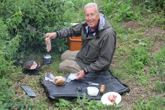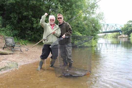 In actual fact for a while things went quiet, not a problem, it gave Bob chance to display his on the bank cooking prowess. MasterChef does bacon and egg butties! With the morning coming to a close, we thought our chances were over till later in the day, but we were wrong as a gentle tap on my left-hand rod, developed into a proper bite and I was playing what was obviously a good fish. Bob got on the camera, Alfie on the net, and after some anxious moments I had my River Trent carp... pure magic!