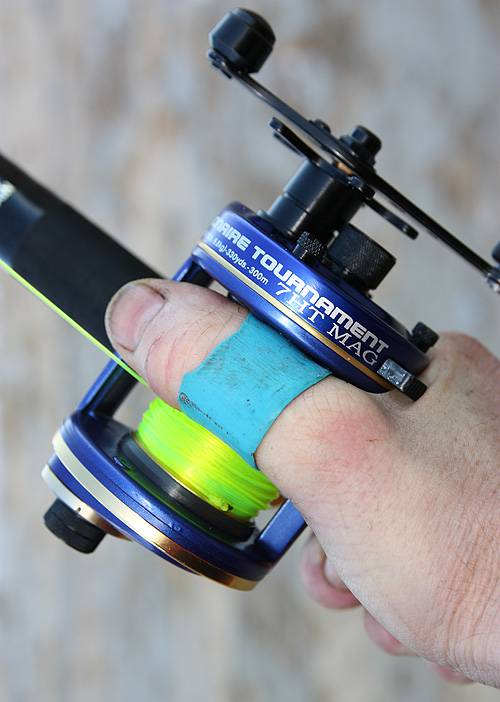 Gripping the spool can also be a problem with wet line so using a short section of a rubber or pvc glove can help. Cut a short section from the finger of the glove and fit it on your thumb between the base and first joint. I use ‘Glovlies’ domestic gloves which are pvc. They seem just right but you will have to search for some as not all supermarkets and hardware shops stock them. However one pair will give enough pieces to last years. Another option is a short piece cut from a cycle inner tube.