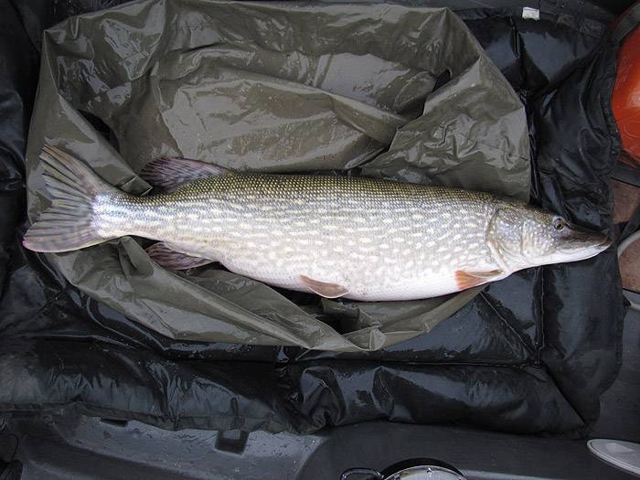 Back in the same spot it’s away again within ten minutes. This time the pike is running fast upwind, usually a sure sign of a better fish. (Big pike generally run faster than little ones, unless they are being chased!) I wound down and it jut kept going, another good sign. When I eventually got it to the surface a big humped back broke the surface. “Oh no not another deformed pike”, remembering the very odd 27 I had from Blithfield years ago. I kept the rod as low as possible not wishing to attract unwanted attention and bundled it into the net. I looked into the net and was confused, it was big alright, but it was almost carp shaped.