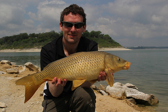 A re-think was needed and we jumped in the car and drove round to a different area that looked good on the map for the last few hours of the afternoon. This second spot looked perfect, and a couple of quick casts with just a lead showed that a lot less snags were present. Having got the rods out it proved to be a good move, as minutes later I was looking down at my first carp of the trip, a long lean common of just over 12lb.