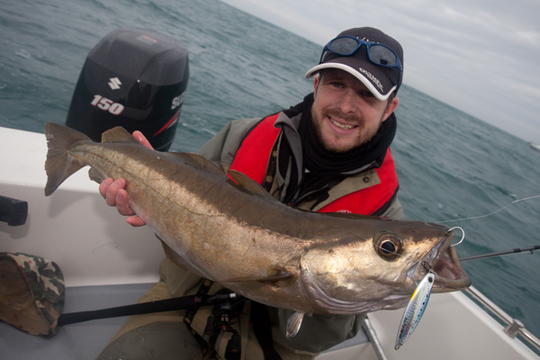 On Halloween I fished with Matt Jones and Sam James, We headed out at the dawn into a lumpy but safe sea. We found plenty of 3-4lb Bass in the shallow water. They would not hit a surface lure but they were quite happy to hit paddle tails. After a couple of hours of sport I did the brave thing and left feeding fish in search of a better stamp. That doesn’t always pay off but the boys were content so I could take a risk. First drift in 60 foot and Matt struck into a nice big pollack while Sam tussled with an 8lb bass. The fish were returned to live and breed another day.